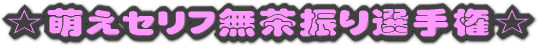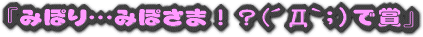 桃色キュート♪Vol.14で見事『萌え〜大賞』に輝いたのは……!? ![]() 宮妃彩 「ひんぬーて言うな!!」 前回に引き続きまさかのあやさま貧乳ネタ(笑)神掛かってました☆ そして見事に初萌え〜大賞受賞おめでとう〜☆ 他メンバーも大健闘! ![]() 滝澤加奈子 「ずっとずっとあなたと一緒にいたいから、だから私は戦うの」 若い!若さ故のアレ☆ ![]() アリス 「今夜は寝かさないぞ!」 睡眠は大事です(^^;) ![]() 大野敦子 「おいしくな〜あ〜れ☆桃キュンマジック〜」 正統派萌えセリフがまさかの…(´Д`;) ![]() MAI 「お兄ちゃん、大好き!」 人生で一度は言われてみたいセリフです(笑) ![]() 桜宮うい 「ちょっとだけ踊るけど笑わないでよね!」 桃キュvol.11にてMAI様がステージ上で放った一言を再現!? ![]() 白井美歩 「愚民ども、ひざまづけ」 みぽりんにこんな事言われたらイヤでもひざまづいてしまいます(^^;) ![]() 綾瀬ユウ 「軟弱者!!それでも男ですか!!」 かっこよくキメ過ぎて結果萌えなかったという…(^^;) |